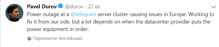 Произошедший утром в четверг, 29 марта сбой в работе Telegram'а вызван отключением питания серверов. Об этом сообщил его основатель Павел Дуров.