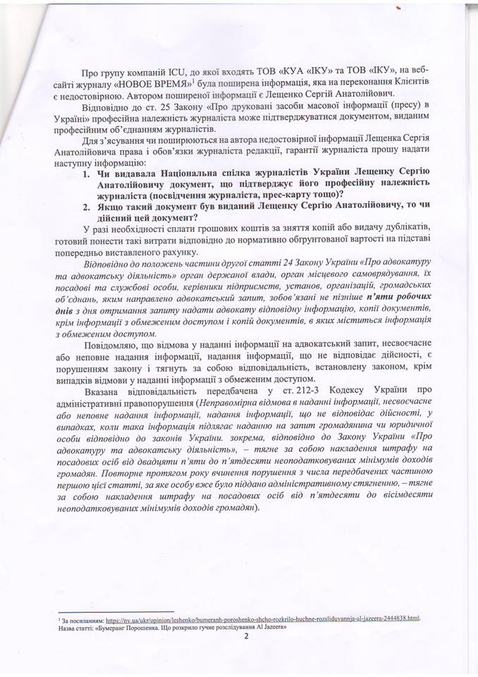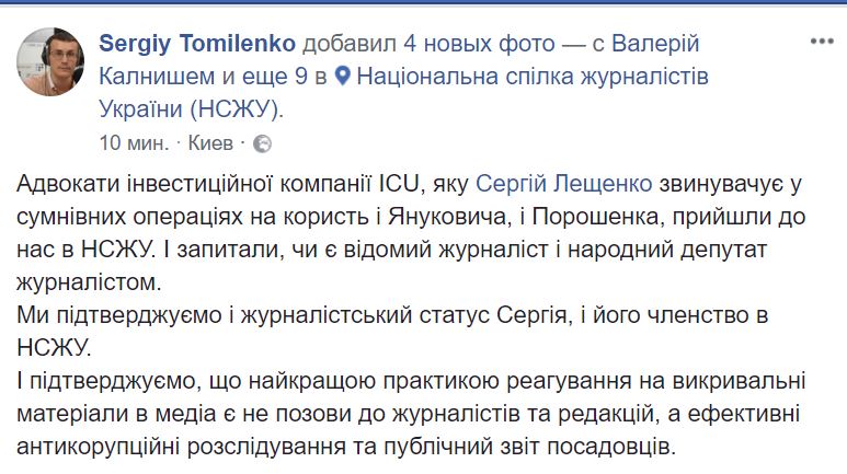 Адвокаты инвестиционной компании ICU, которую нардеп Сергей Лещенко обвиняет в сомнительных операциях в пользу и экс-президента Виктора Януковича и президента Петра Порошенко, пришли в НСЖУ для уточнения: является ли народный депутат журналистом. Об этом глава НСЖУ Сергей Томиленко написал на Facebook.