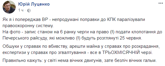 Генпрокурор Луценко заявил, что недавнее изменение Уголовного процессуального кодекса Украины "поправками Лозового" уже привели к возникновению трехмесячных очередей в судах. Это, в свою очередь, парализовало правоохранительную систему.