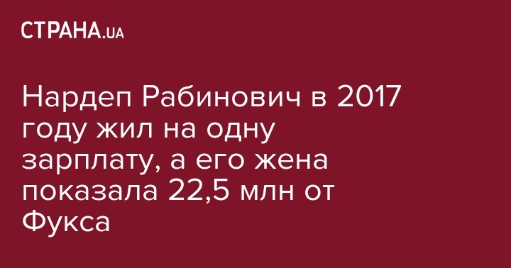 Жена Рабиновича помимо дохода от Фукса задекларировала 74 тыс. гривен зарплаты, 19,5 млн гривен и 100 тыс. долларов наличными.