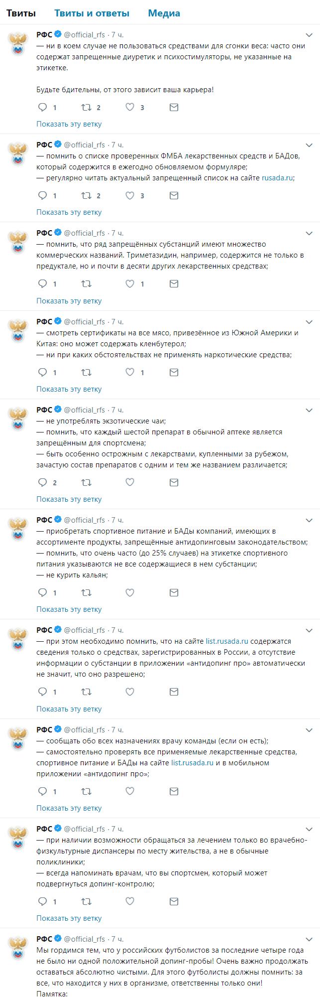 "Мы гордимся тем, что у российских футболистов за последние четыре года не было ни одной положительной допинг-пробы! Очень важно продолжать оставаться абсолютно чистыми. Для этого футболисты должны помнить: за все, что находится у них в организме, ответственны только они!", говорится в сообщении РФС.