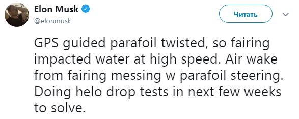 По его словам, из-за перекрутившегося парашюта обтекатель не смог совершить мягкую посадку и разбился о воду.