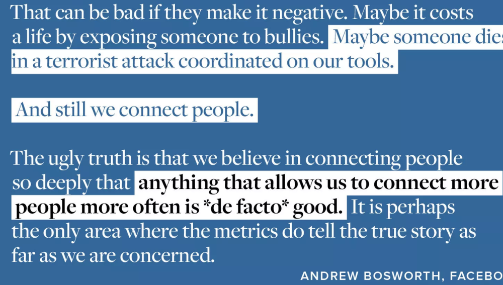 "Уродливая правда состоит в том, что мы настолько глубоко верим в соединение людей, что все, позволяющее нам чаще связывать людей, - это "де-факто" хорошо", - писал Босуорт.
