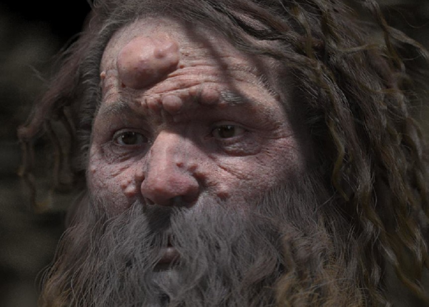 Изучив череп мужчины, антропологи увидели на его лице много шишек. Вероятно, древний сородич страдал нейрофиброматозом первого типа (повреждение гена, который несет ответственность за синтез всех важных ферментов в организме человека).