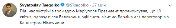 "Во время встречи с общиной Мариуполя Президент проанонсировал, что 10 апреля, сразу после Пасхи, осуществит визит в Берлин для переговоров с канцлером Германии", - написал Цеголко.
