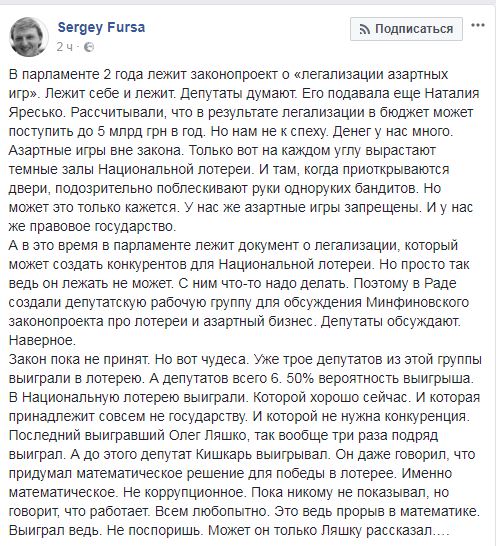 В самой "Национальной лотерее" выигрыш Ляшко комментировать тогда не стали, сославшись на конфиденциальность этой информации. Однако инвестбанкир Сергей Фурса тогда написал в Facebook, что легализация средств через выигрыш именно в эту лотерею - привычное дело для парламентариев (по его данным, кроме Ляшко джек-пот сорвали еще трое нардепов).