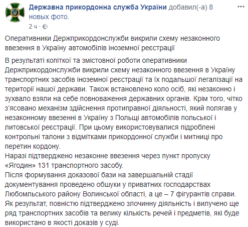 "В результате кропотливой и содержательной работы оперативники Госпогранслужбы разоблачили схему незаконного ввоза в Украину транспортных средств иностранного регистрации и их дальнейшей легализации на территории нашего государства. Также установлен круг лиц, которые незаконно и дерзко взяли на себя полномочия государственных органов. Кроме того, четко выяснен механизм осуществления противоправной деятельности, который заключался в незаконном ввозе в Украину из Польши автомобилей польской и литовской регистрации. При этом использовались поддельные контрольные талоны с отметками пограничной службы и таможни о пересечении границы", - говорится в сообщении Госпогранслужбы.
