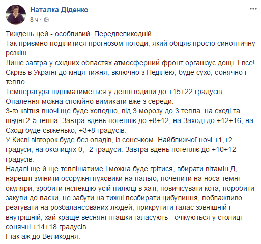 "Только завтра в восточных областях атмосферный фронт организует дожди. И все! Везде в Украине до конца недели, включая Воскресенье, будет сухо, солнечно и тепло. Температура будет подниматься в дневные часы до +15 ...+22 градусов. Отопление можно спокойно выключать уже со среды. 3 апреля ночью еще будет холодно, от 3 мороза до 3 тепла. На востоке и юге 2-5 тепла. Завтра днем потеплеет до + 8 + 12, на Западе до +12 ...+16 на Востоке будет свеженькое, + 3... + 8 градусов. В Киеве вторник будет без осадков, с солнышком. Ближайшей ночью + 1 - + 2 градуса, в окрестностях 0 .. -2 градуса. Завтра днем потеплеет до +10... +12 градусов. В дальнейшем еще и еще теплеть и можно будет греться, впитывать витамин Д, наконец изменить противные пуховики на пальто, повесить на нос темные очки, сделать инспекцию всей пыли в доме, вычесать кота, сделать покупки к Пасхе, не забыть на неделе собрать луковой шелухи, снисходительно реагировать на разбалансированных людей, прикрутить шум внешний и внутренний, пусть лучше весенние птички шумят - ожидаются в столице солнечные + 14 ... + 18 градусов", - написала она.