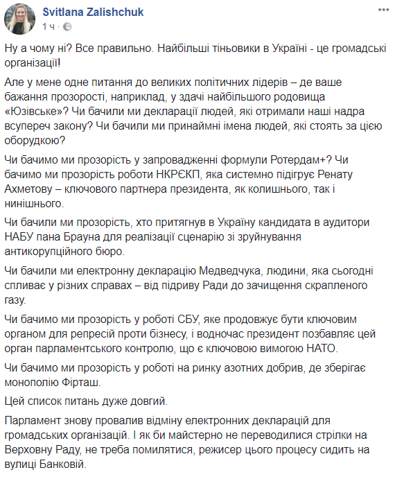 "Парламент снова провалил отмену электронных деклараций для общественных организаций. И как бы искусно не переводились стрелки на Верховную Раду, не надо ошибаться, режиссер этого процесса сидит на улице Банковой", - написала Залищук в Facebook.