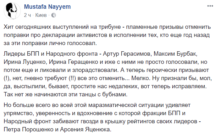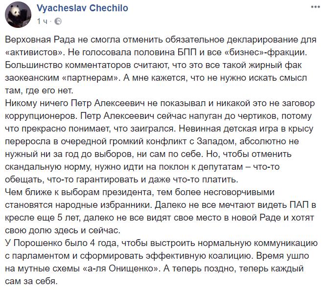 Вот что пишет журналист Вячеслав Чечило: "Верховная Рада не смогла отменить обязательное декларирование для "активистов". Не голосовала половина БПП и все "бизнес"-фракции. Большинство комментаторов считают, что это все такой жирный фак заокеанским "партнерам". А мне кажется, что не нужно искать смысл там, где его нет.