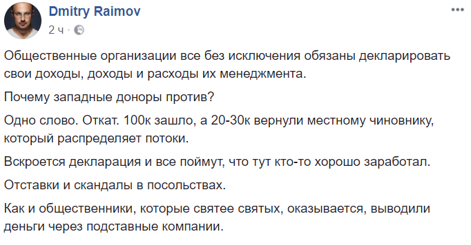 Как и общественники, которые святее святых, оказывается, выводили деньги через подставные компании", - пишет политтехнолог Дмитрий Раимов.