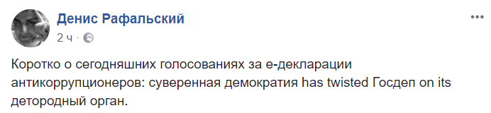 "Коротко о сегодняшних голосованиях за е-декларации антикоррупционеров: суверенная демократия has twisted Госдеп on its детородный орган", - пишет Рафальский.