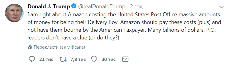 "Я прав в том, что Amazon стоит огромных сумм денег Почтовой службе Соединенных Штатов, которая у нее на посылках. Amazon должна оплачивать эти затраты (дополнительно), а не возлагать их на американского налогоплательщика. Многие миллиарды долларов. Руководители почты и не подозревают (или все-таки подозревают?)!", - написал Трамп.