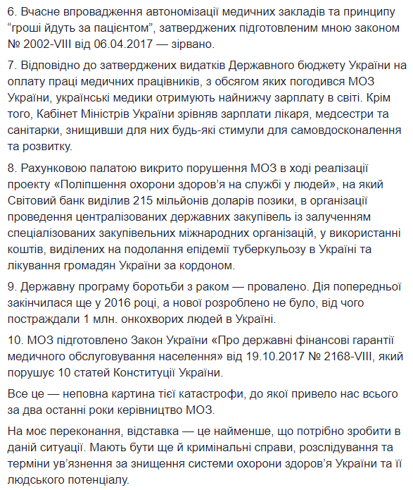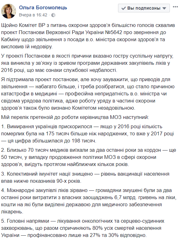 Также Богомолец опубликовала список претензий к Супрун. Впрочем, неизвестно, вошли они в таком виде в постановление комитета - оно еще не опубликовано на сайте Верховной Рады: