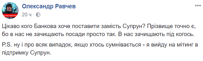 P.S. ну и на всякий случай, если кто-то сомневается - я выйду на митинг в поддержку Супрун", - пишет активист Александр Равчев.