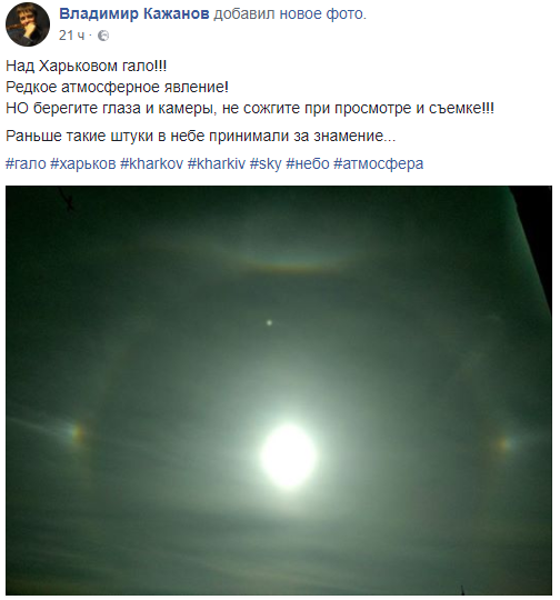 "Гало в небе над Харьковом 5.04.18 !!! Редкое атмосферное явление! Но берегите глаза и камеры, не спали при просмотре и съемке!", - написал в соцсети астроном и добавил, что раньше такие явления в небе воспринимали как знамение.