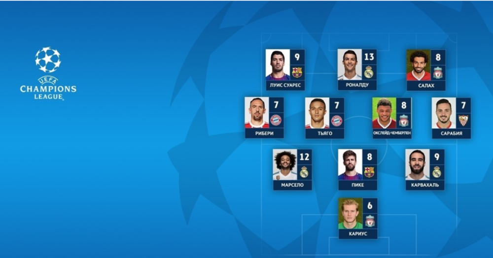Неудивительно, что в нее вошли сразу по три игрока мадридского "Реала" (обыграл в гостях итальянский "Ювентус" со счетом 3 - 0, а Роналду забил фантастический гол бисиклетой - Прим.Ред.) и "Ливерпуля", который сотворил сенсацию, разгромив на своем поле грозный "Манчестер Сити" Пепа Гвардиолы (3 - 0).