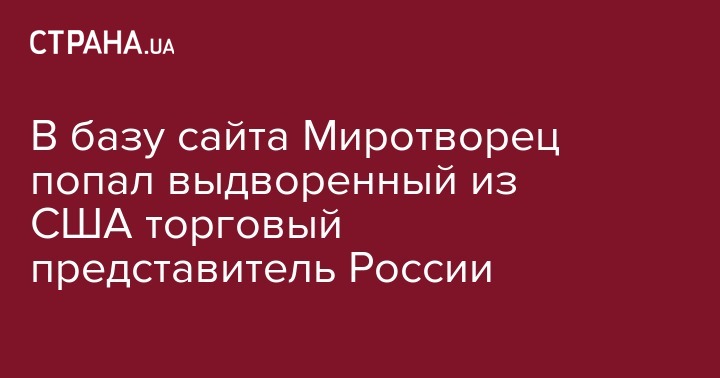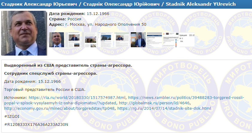 Высланный из США торговый представитель Российской Федерации Александр Стадник оказался в базе сайта "Миротворца" как "выдворенный из США представитель страны-агрессора" и "сотрудник спецслужб страны-агрессора".