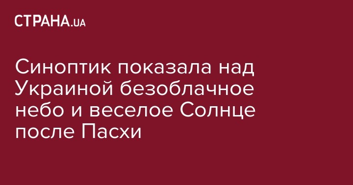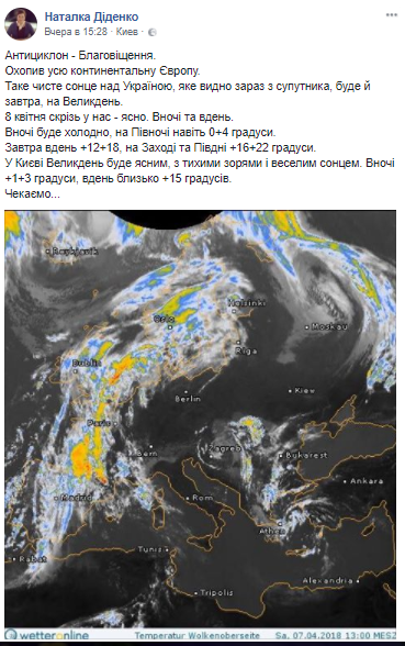 "Такое чистое солнце над Украиной, которое видно сейчас со спутника, будет и завтра, на Пасху. 8 апреля везде у нас - ясно. Ночью и днем. Ночью будет холодно, на севере даже 0 + 4 градуса. Завтра днем 12 + 18, на Западе и Юге + 16 + 22 градуса. В Киеве Пасха будет ясной, с тихими звездами и веселым солнцем. Ночью 1 + 3 градуса, днем около +15 градусов.