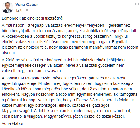 Лидер венгерской праворадикальной партии "Йоббик" Габор Вона объявил о своей отставке и отказался от депутатского мандата из-за провала на выборах.