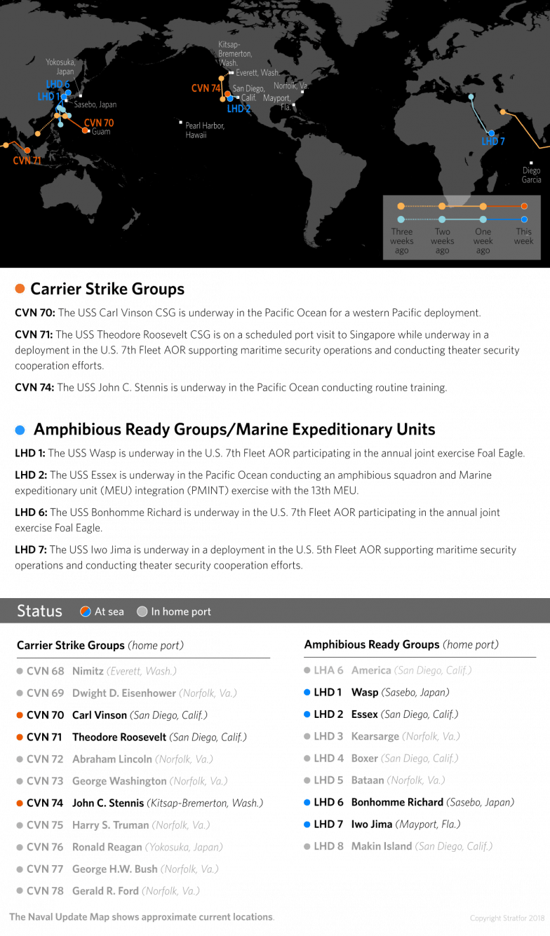 Дислокация авианосцев и амфибийных передовых групп. Согласно данным американского издания "Стратфор", оперативная обстановка по состоянию на 4 апреля с.г. (более поздних данных нет) в морских акваториях на ближних и дальних подступах к Сирии следующая. Авианосцы "Авраам Линкольн" и "Джордж Буш", ранее выходившие на тактическую подготовку в Атлантический океан, вернулись в свои базы. Авианосец "Теодор Рузвельт" находится с визитом в Сингапуре. Авианосцы "Карл Винсон" и "Джон Стеннис" оперируют в составе 7-го флота США в Тихом океане. Других развернутых где-либо в Мировом океане авианосных ударных групп США, по данным "Стратфора", на 4 апреля не фиксируется.