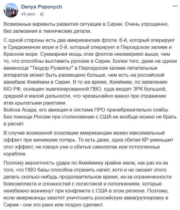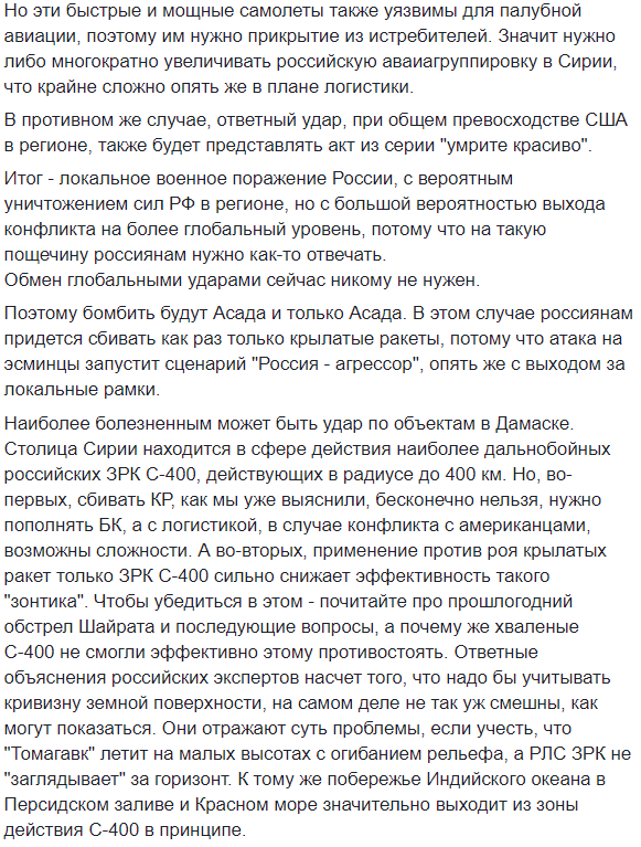 При этом он считает, что в регионе российские силы теоретически проигрывают военное противостояние с США, у которых рядом находятся мощные авианесущие группировки. Но до это дело пока не дойдет.