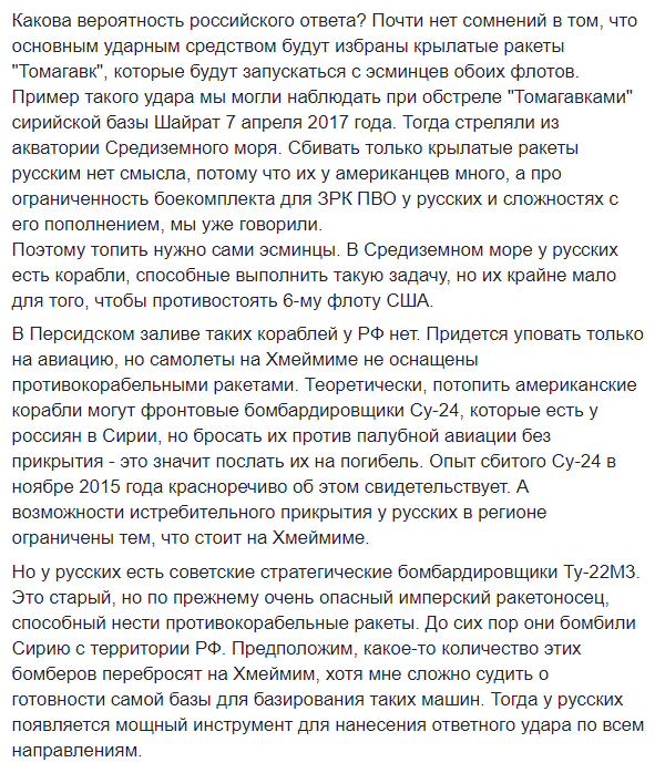Какова вероятность российского ответа? Почти нет сомнений в том, что основным ударным средством будут избраны крылатые ракеты "Томагавк", которые будут запускаться с эсминцев обоих флотов. Пример такого удара мы могли наблюдать при обстреле "Томагавками" сирийской базы Шайрат 7 апреля 2017 года. Тогда стреляли из акватории Средиземного моря. Сбивать только крылатые ракеты русским нет смысла, потому что их у американцев много, а про ограниченность боекомплекта для ЗРК ПВО у русских и сложностях с его пополнением, мы уже говорили.