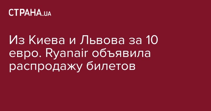 Авиакомпания-лоукостер Ryanair объявила о распродажи со скидкой до 20% за билеты на все украинские направления. Минимальные цены вылета из Киева и Львова начинаются от 10 евро в одну сторону.