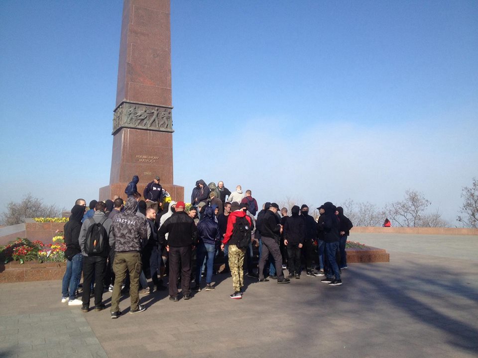 Их около 60 человек во главе с лидером Демьяном Ганулом. Они сожгли георгиевскую ленту, которую кто-то положил к памятнику Неизвестному матросу.