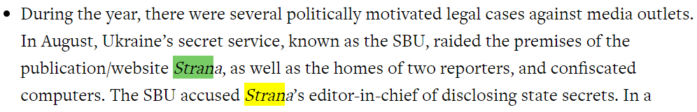 "В течение года было несколько политически мотивированных дел против средств массовой информации. В августе спецслужба Украины, известная как СБУ, вторглась в помещение сайта "Страна", а также в дома двух журналистов и конфисковала компьютеры.
