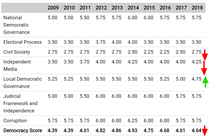 Рейтинг гражданского общества снизился с 2,50 до 2,75. Это произошло из-за "клеветнических кампаний" против неправительственных организаций, а также введения электронного декларирования для антикоррупционных активистов.