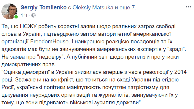 "То, что НСЖУ делает корректные заявления относительно реальных угроз свободе слова в Украине, подтверждено отчетом авторитетной американской организации Freedom House. И лучшей реакцией чиновников и их адвокатов должно быть не обвинение американских экспертов в "зраде". Не заявления о "недоверии". А публичный отчет по претензиям о притеснениях демократических прав", – написал он в Facebook.