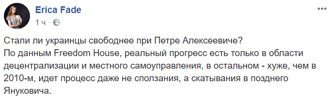 "Стали ли украинцы свободнее при Петре Алексеевиче? По данным Freedom House, реальный прогресс есть только в области децентрализации и местного самоуправления, в остальном – хуже, чем в 2010-м, идет процесс даже не сползания, а скатывания в позднего Януковича", – пишет пользователь Facebook Erica Fade.