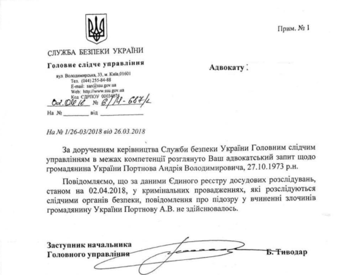 Известный юрист Андрей Портнов обнародовал письменный ответ на его запрос, в котором сообщается, что в уголовных производствах, которые расследует СБУ, ему не было объявлено ни одной "пидозры".