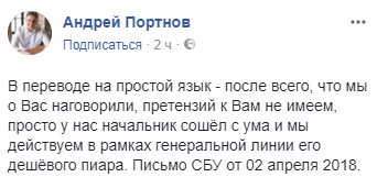 "В переводе на простой язык - после всего, что мы о Вас наговорили, претензий к Вам не имеем, просто у нас начальник сошел с ума и мы действуем в рамках генеральной линии его дешёвого пиара", - прокомментировал Андрей Портнов.