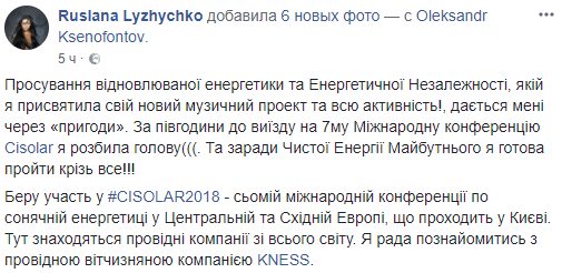 На этот раз артистка разбила голову, собираясь на международную конференцию по продвижению возобновляемой энергетики и энергетической независимости. Инцидент, о котором Руслана рассказала на своей странице в  Facebook произошел за полчаса до мероприятия.