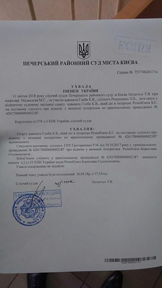 "Руководствуясь статьей 376 части 2 Криминально-процессуального кодекса Украины, следственный судья постановил: жалобу адвоката Глобы К. В., который действует в интересах Розенблата Борислава Соломоновича, на постановление следователя об отказе в признании потерпевшим по уголовному производству №420170000000002187 удовлетворить. Отменить постановление следователя ГПУ Григоришина Р. М. от 19 октября 2017 года в уголовном производстве №420170000000002187 об отказе в признании потерпевшим Розенблата Б. С. Обязать следователя в уголовном производстве №420170000000002187 исполнить требования части 2 статьи 55 Уголовно-процессуального кодекса относительно Розенблата Б. С. Постановление обжалованию не подлежит", — сказано в документе.