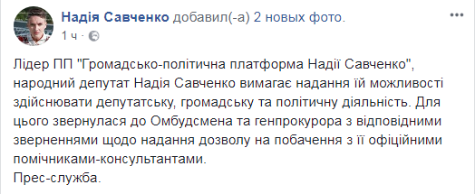 Сканкопии соответствующих обращений Савченко на имя генерального прокурора Юрия Луценко и омбудсмена Людмилы Денисовой обнародовала пресс-служба нардепа на ее странице Facebook в среду, 11 апреля.