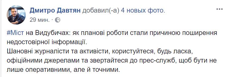 "Мост на Выдубичах планово ремонтируют, угрозы для участников дорожного движения нет", - написал он.