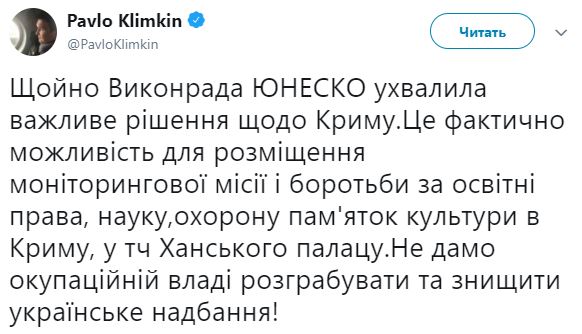 "Исполнительный совет ЮНЕСКО принял важное решение по Крыму. Это фактически возможность для размещения мониторинговой миссии и борьбы за образовательные права, науку, охрану памятников культуры в Крыму, в т.ч. Ханского дворца. Не дадим оккупационной власти разграбить и уничтожить украинское достояние", - написал глава МИД Украины.