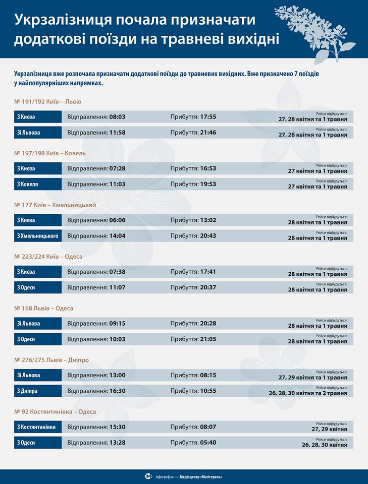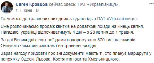 "Уже начинаем продажу билетов на дополнительные поезда на конец апреля. Напомню, украинцы будут отдыхать 4 дня - с 28 апреля по 1 мая", - написал в соцсети Кравцов.
