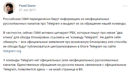 Также он опроверг сообщения СМИ, что компания работает над простым методом обхода блокировки сервиса в России. "Не дайте себя обмануть - все официальные заявления про возможную блокировку или способы ее обхода будут публиковаться централизованно в блоге Telegram на сайте telegram.org", - написал Дуров на своей странице во "ВКонтакте".