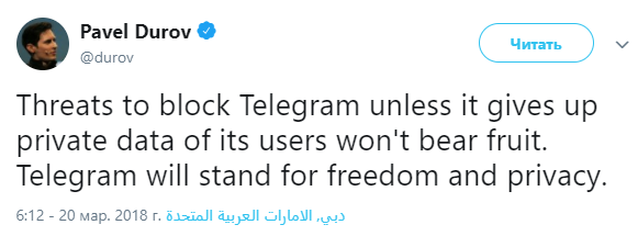 "Угрозы заблокировать Telegram, если не будут выданы частные данные его пользователей, не принесут плодов. Telegram будет отстаивать свободу и неприкосновенность частной жизни", — заявил Дуров в своем Twitter.