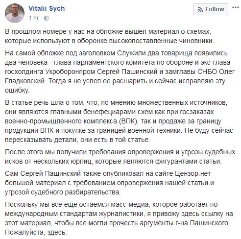 После публикации статьи в журнале "Новое Время" под заголовком "Служили два товарища" о коррупции на  госзаказах военно-промышленного комплекса с участием нардепа от "Народного фронта" Сергея Пашинского и заместителя секретаря СНБО Олега Гладковского в редакцию журнала посыпались угрозы. Об этом написал главный редактор издания "Новое Время" Виталий Сыч у себя в Facebook.