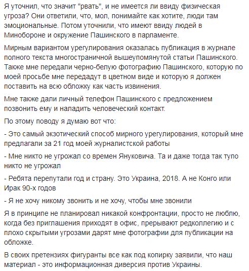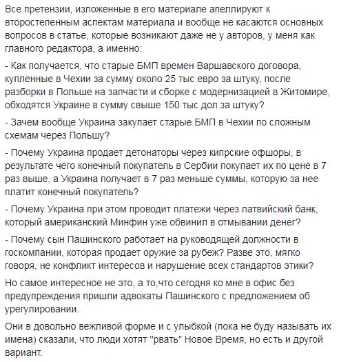 "Они в довольно вежливой форме и с улыбкой (пока не буду называть их имена) сказали, что люди хотят "рвать" Новое Время, но есть и другой вариант, - пишет Сыч. - Я уточнил, что значит "рвать", и не имеется ли ввиду физическая угроза? Они ответили, что, мол, понимайте как хотите, люди там эмоциональные. Потом уточнили, что имеют ввиду людей в Минобороне и окружение Пашинского в парламенте.