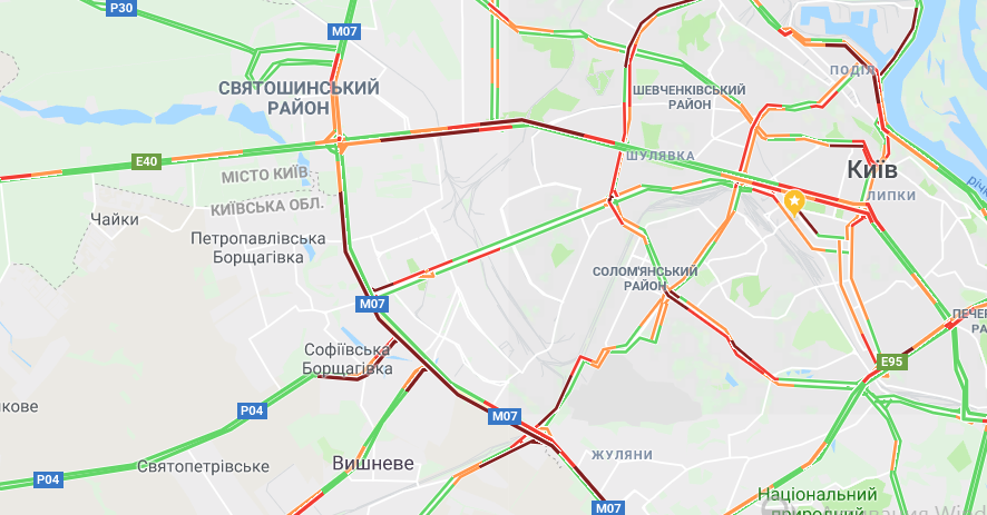 Пробки на Окружной дороге и в центре Киева. Фото: google.com.ua/maps