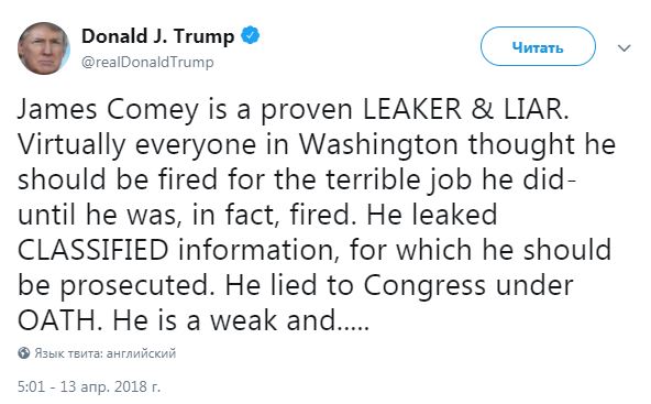 "Практически все в Вашингтоне были уверены, что его нужно уволить за ужасную работу, пока в конце концов он не был уволен. Он "слил" секретную информацию, за что должен быть привлечен к ответственности. Он лгал Конгрессу под присягой (очевидно, речь идет о показаниях Коми относительно расследования о вмешательстве России в выборы президента США - Прим. Ред.)", - отметил Трамп.