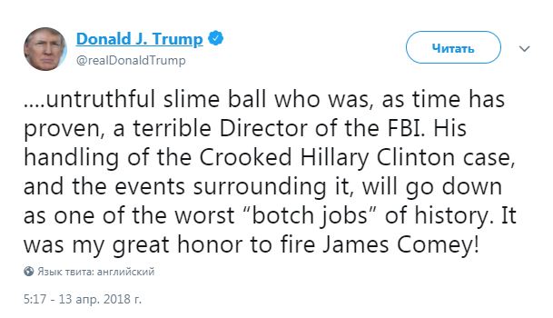 Президент США также назвал Коми "слабым и лживым слизняком", который, "как показало время, был ужасным директором ФБР".