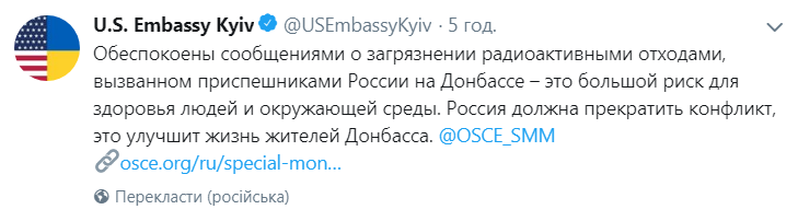 "Обеспокоенные сообщениями о загрязнении радиоактивными отходами, вызванное приспешниками России на Донбассе - это большой риск для здоровья людей и окружающей среды. Россия должна прекратить конфликт, это улучшит жизнь жителей Донбасса", - говорится в опубликованном сообщении.