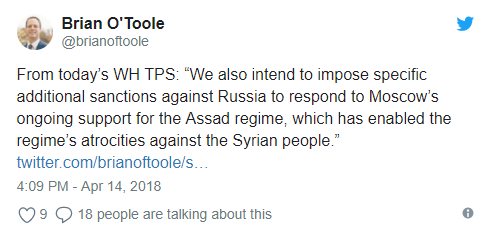 "Санкции против России на подходе. Министр финансов Стивен Мнучин объявит о них в понедельник, если он еще этого не сделал, и они будут направлены на все компании, которые работали с техническим оснащением, имевшим отношение к Асаду и применению химического оружия", - заявила Хейли.